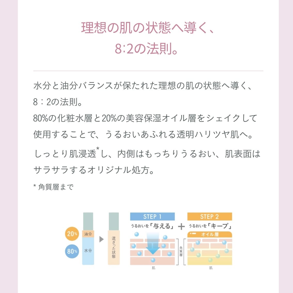 水分量と油分量を共にチャージすることで、うるおいを「与えて」×「キープ」。