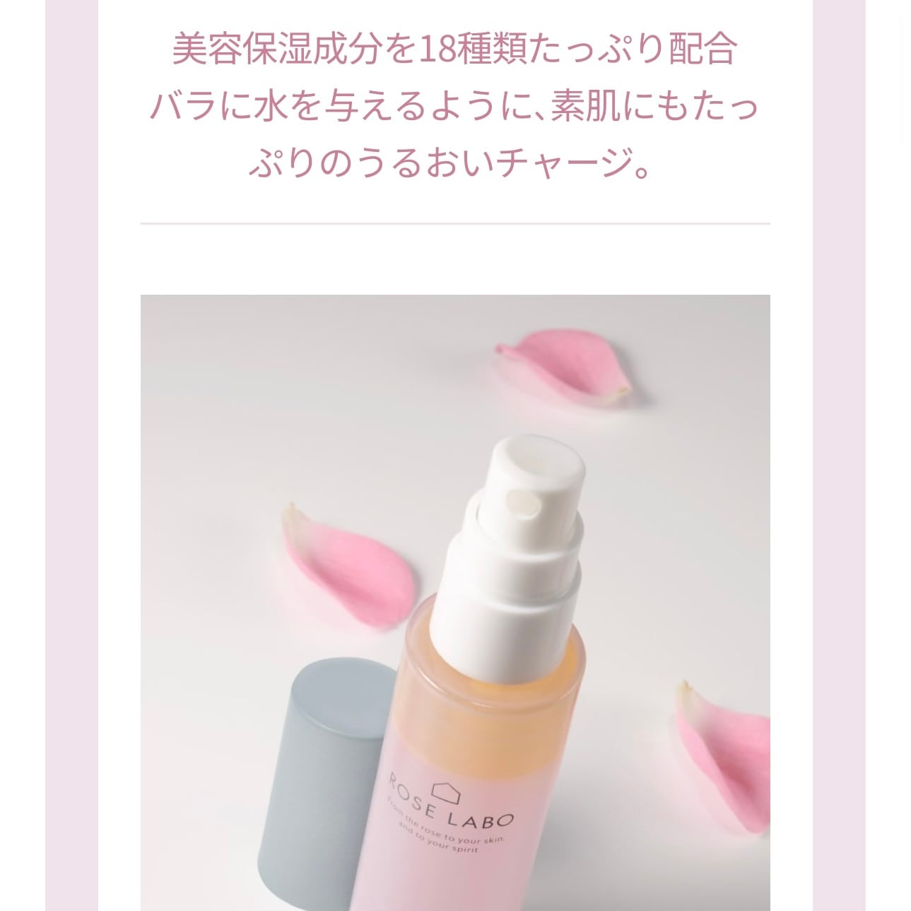 私たちが育てる国産で農薬不使用の食べられるバラ*を含む18種類の美容保湿成分で、角質層のすみずみまでたっぷりのうるおいで満たし、透明感あふれるツヤ肌へ。
