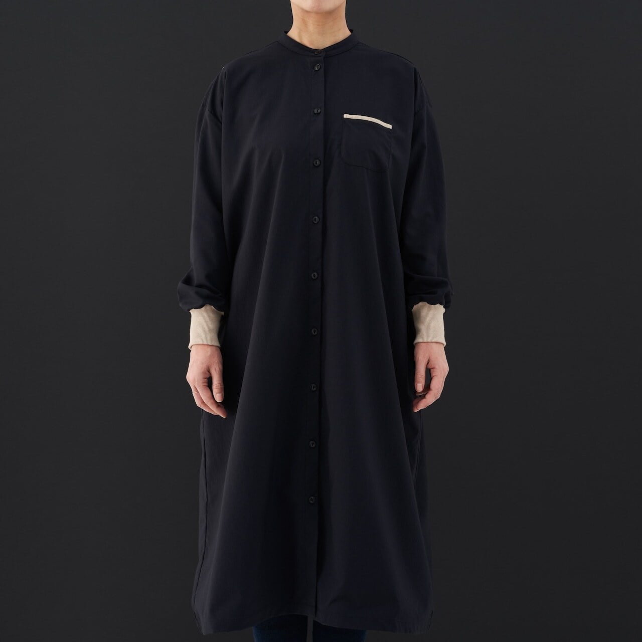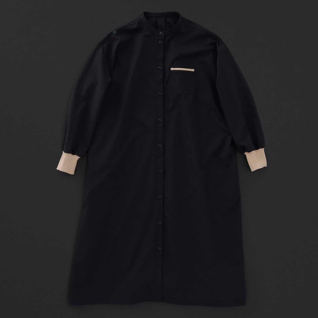 コットンナイロンストレッチ生地のドロップショルダー型ワンピース。