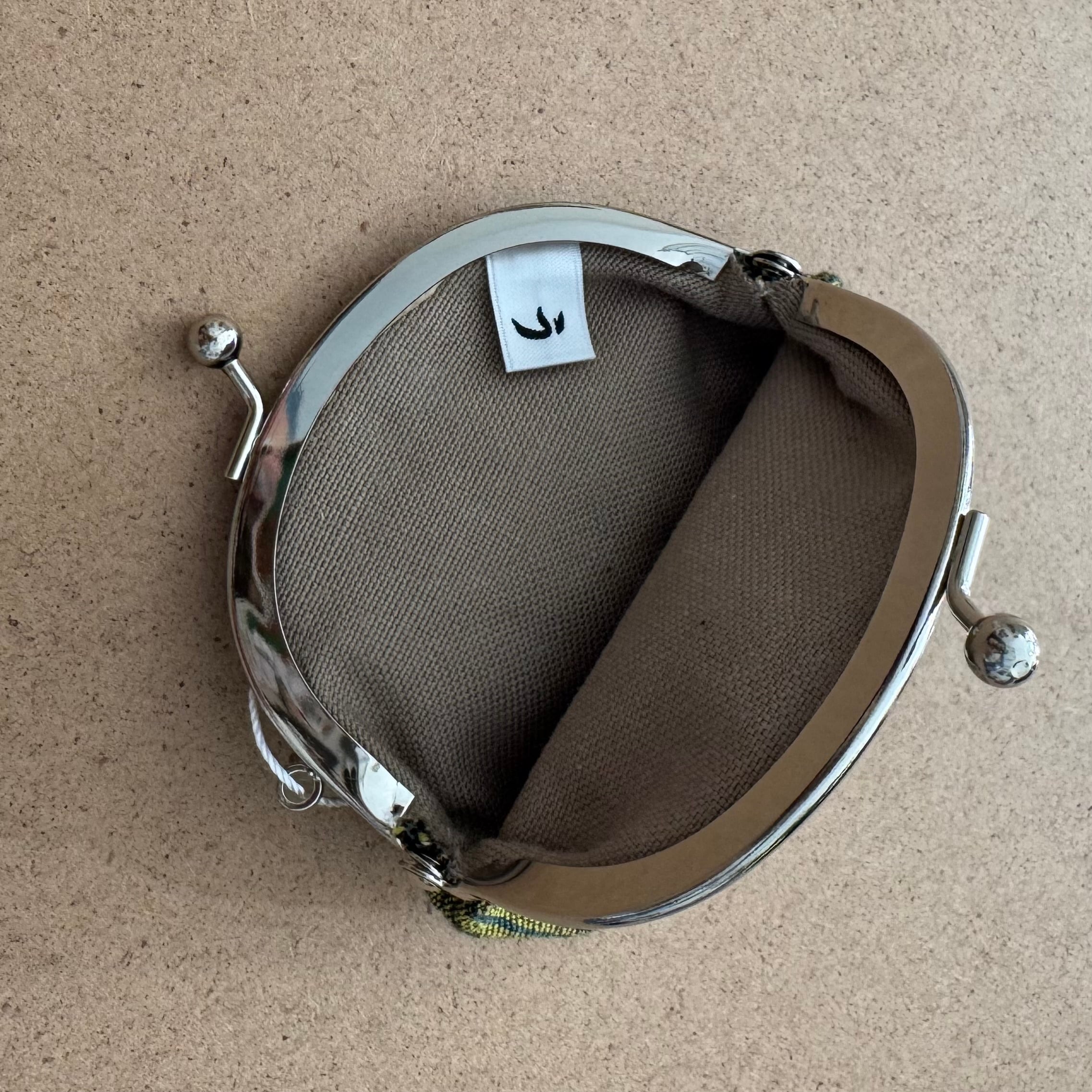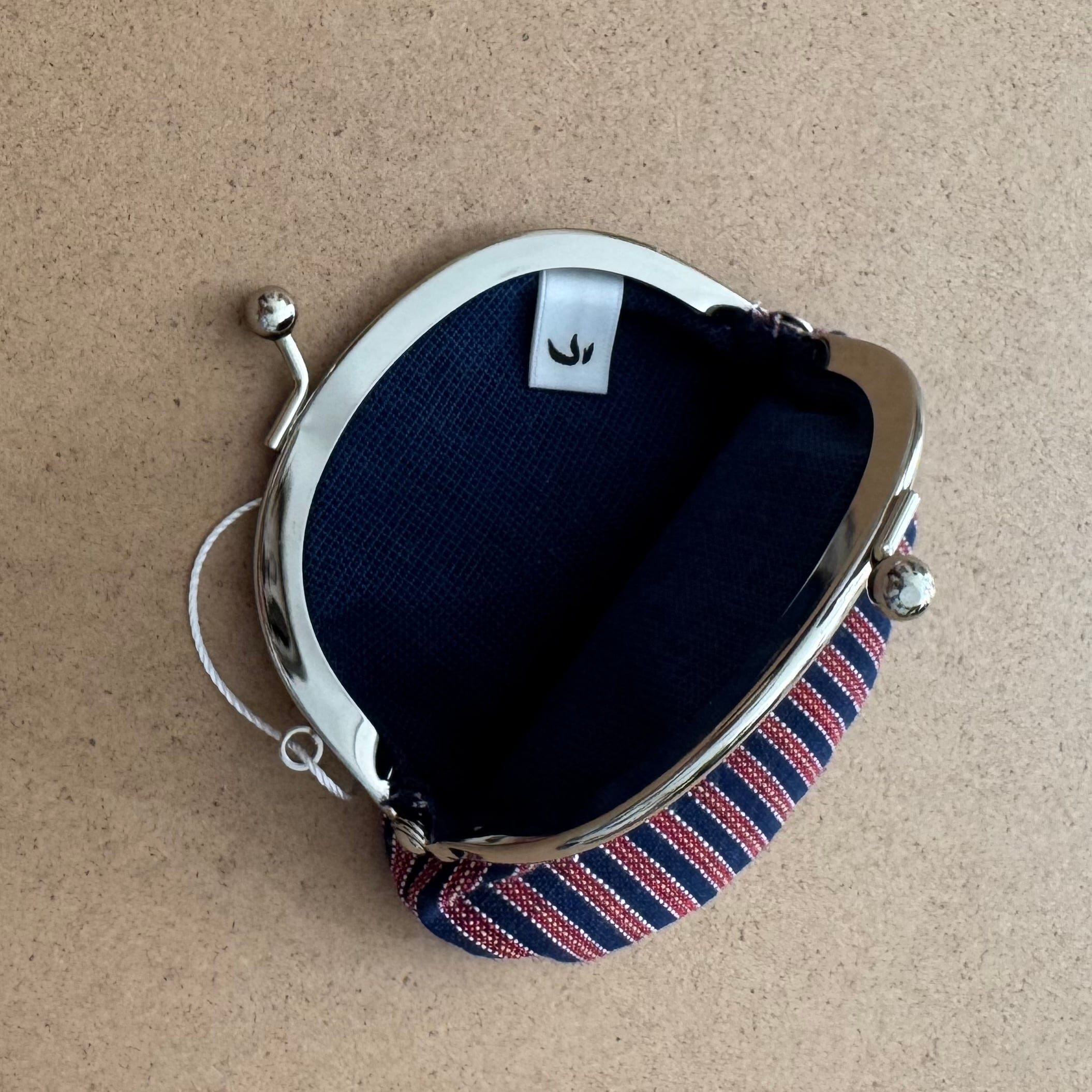 久留米絣の生地を使用したがまぐちです。もんぺを生産していく中で生まれる長さの足りない生地を、無駄なく活用したいという思いから生まれました。