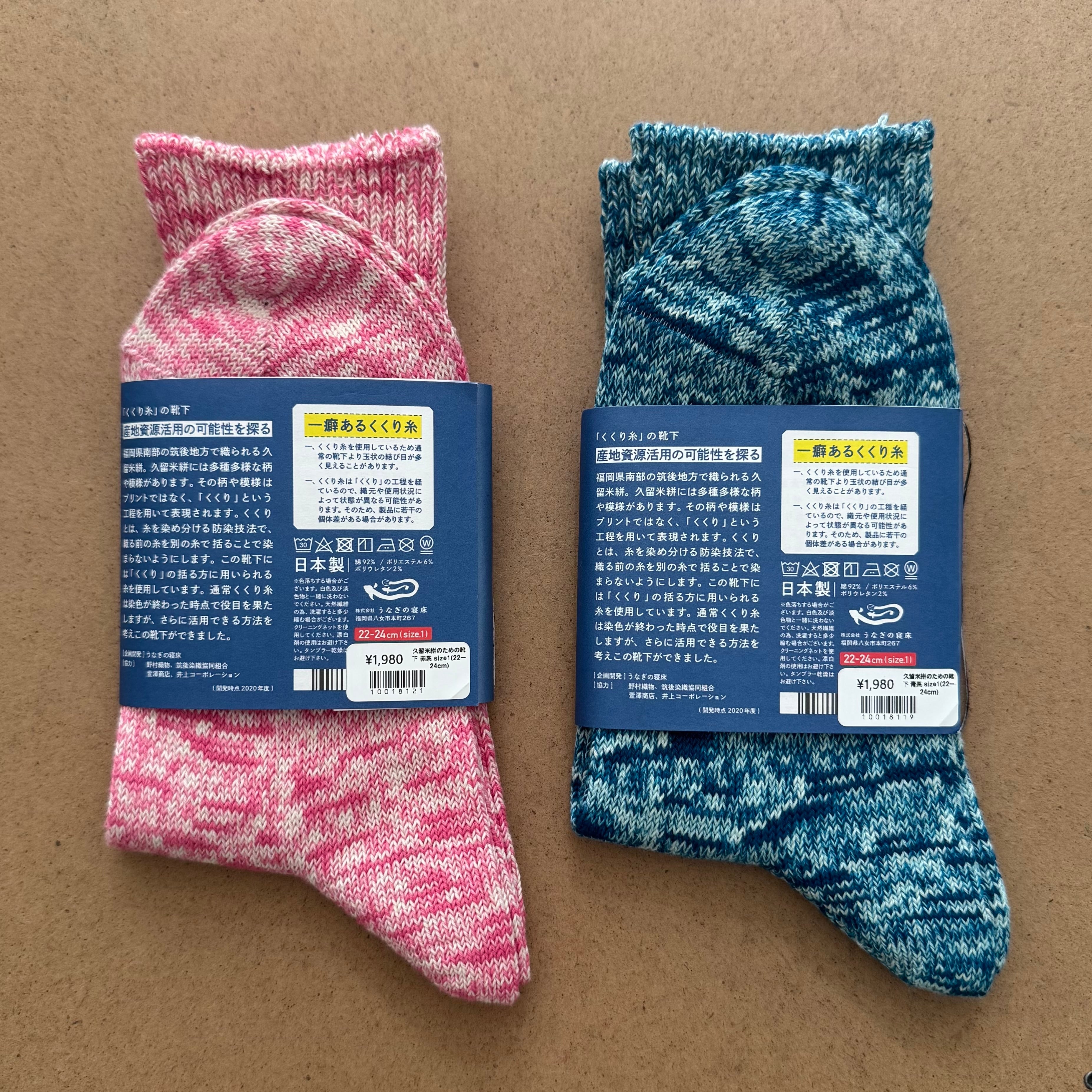 くくり糸は久留米絣にとって欠かすことのできない存在ですが、通常「くくり」の工程による染め分けを終えると役目を果たします。この産地資源であるくくり糸を活用できないかと模索していく中で靴下という形にたどり着きました。