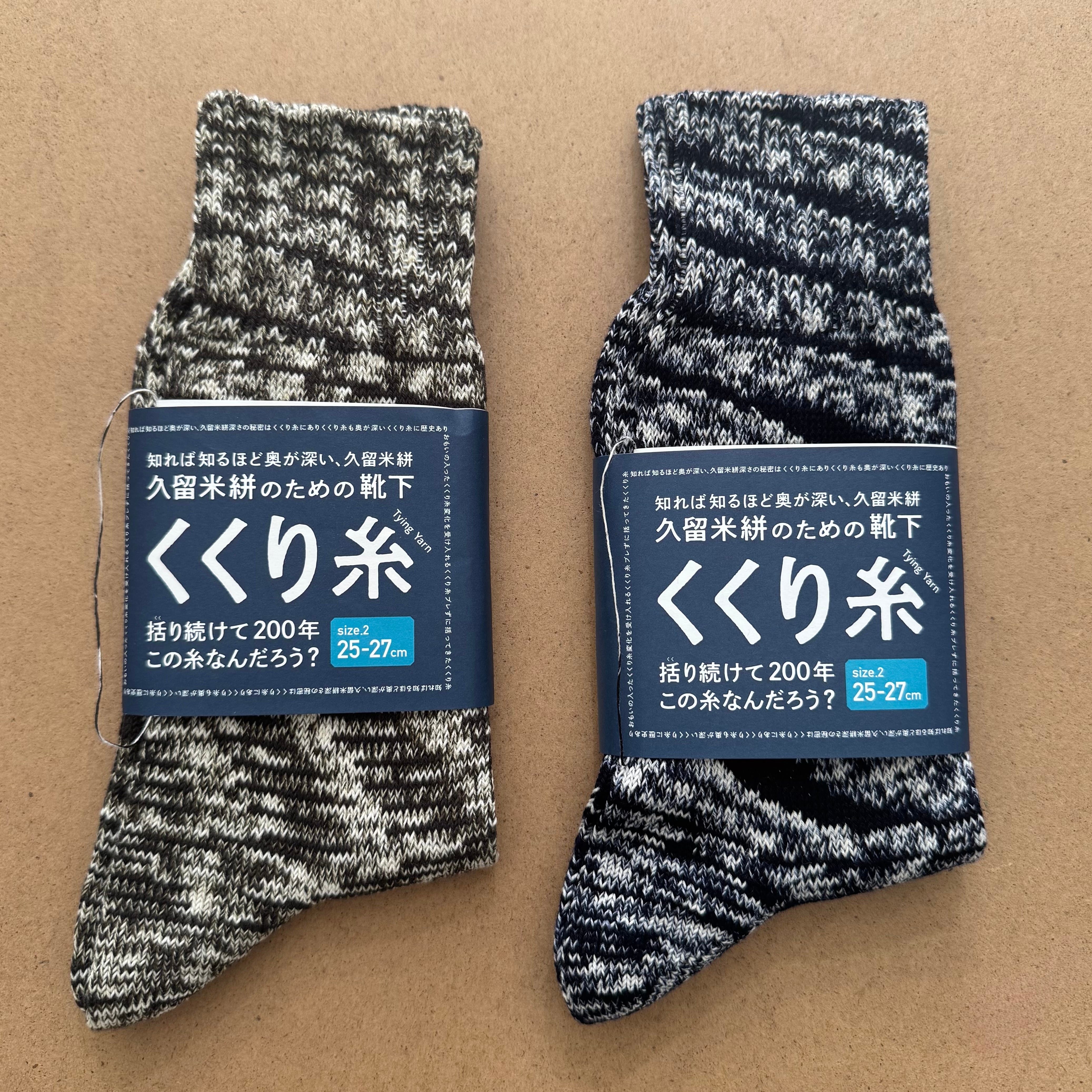 くくり糸は久留米絣にとって欠かすことのできない存在ですが、通常「くくり」の工程による染め分けを終えると役目を果たします。この産地資源であるくくり糸を活用できないかと模索していく中で靴下という形にたどり着きました。